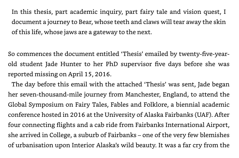 The narration has a certain quality to it, almost as if it’s reporting on a real event. This makes sense as readers soon learn that Bear Season takes the form of found texts and fabricated citations (Think: His Bloody Project). Eventually we learn that the voice is a journalist’s who is digging into the disappearance of a young PhD student.